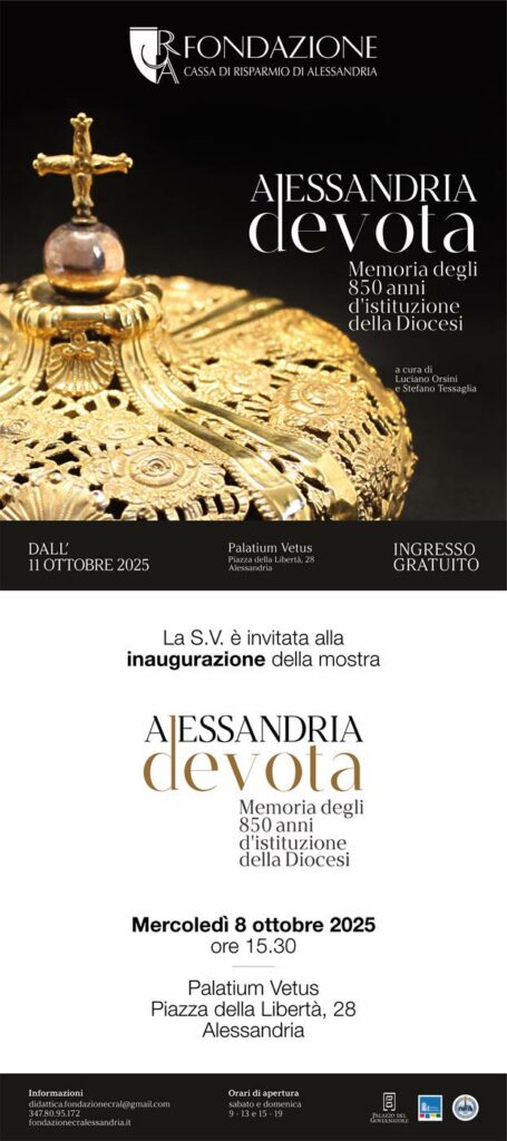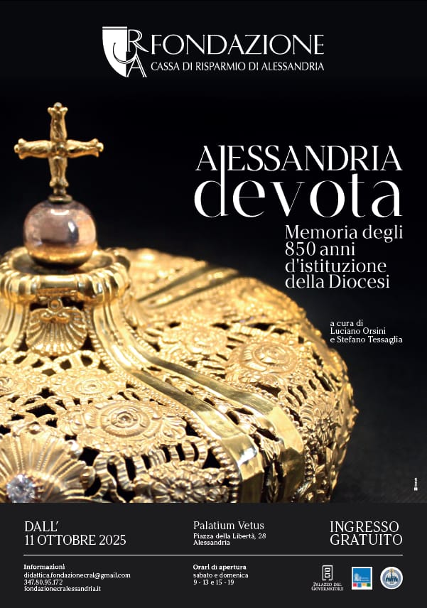 Mercoledì 8 ottobre alle 15.30, a Palatium Vetus, la Diocesi di Alessandria e la Fondazione CRAL inaugurano una mostra unica: un viaggio tra arte sacra, oreficeria gemmologia, paramenti sacri e opere devozionali, nel cuore della nostra Chiesa alessandrina.