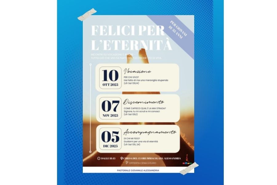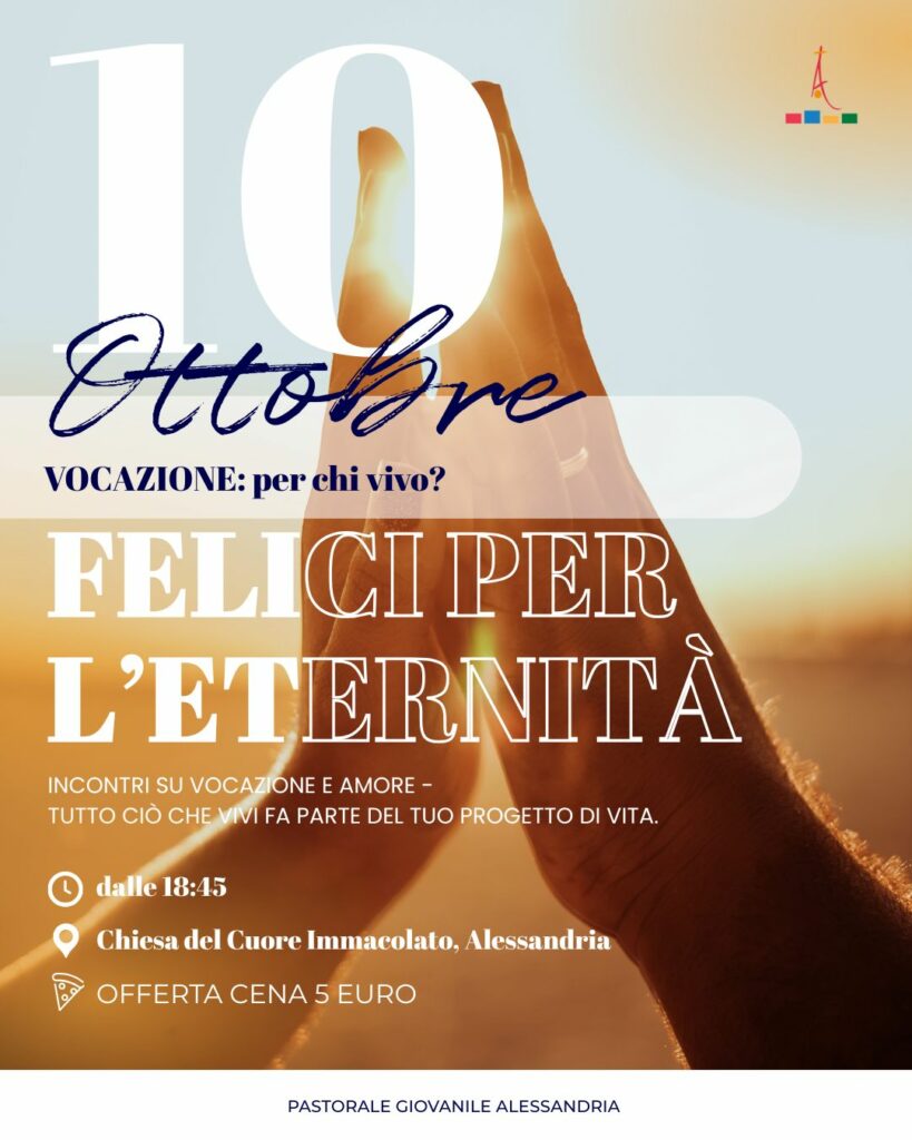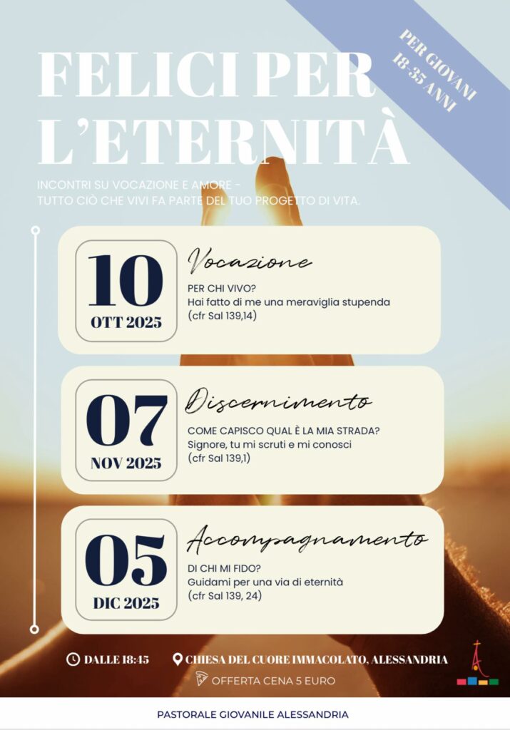 Si intitola “Felici per l’eternità” il ciclo di tre incontri su vocazione e amore, organizzato dalla pastorale giovanile diocesana. Questi appuntamenti, dedicati ai giovani fino ai 35 anni, si terranno alla parrocchia Cuore Immacolato di Maria (via Monteverde 2, Alessandria).