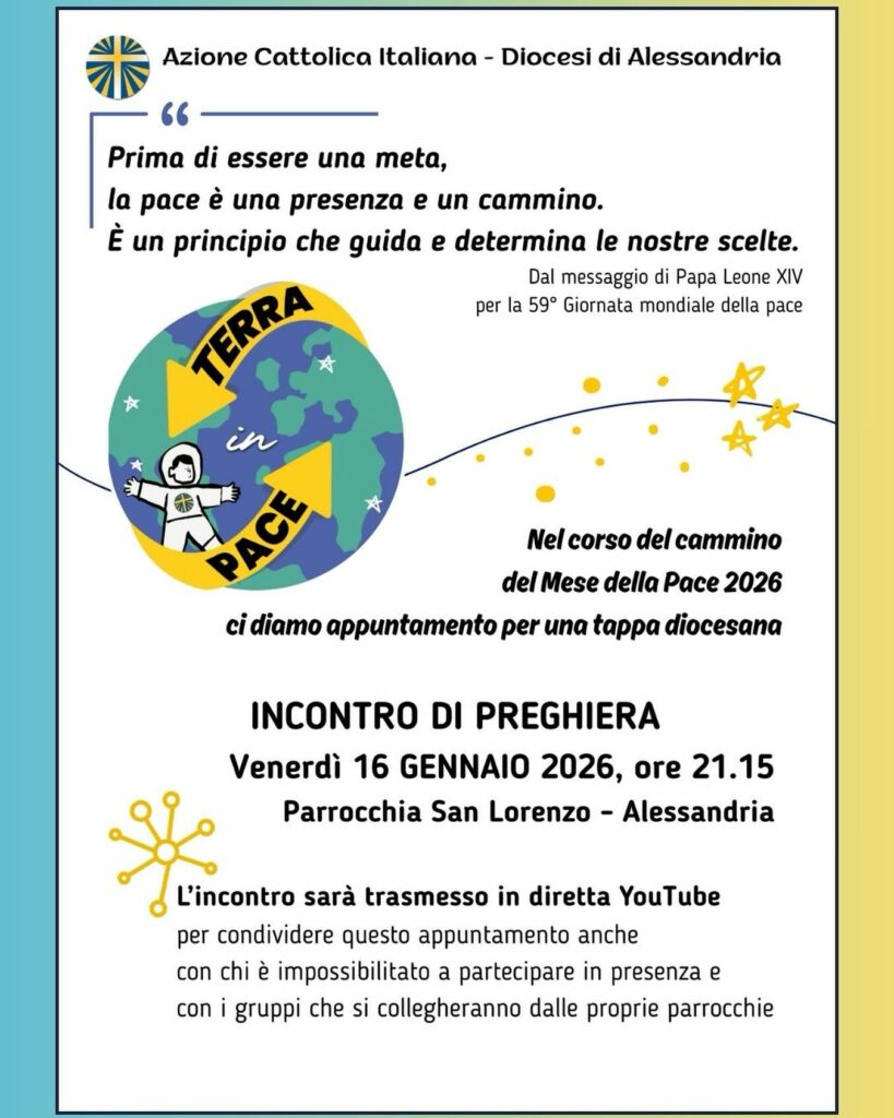 Nel cammino del Mese della Pace 2026, l’Azione Cattolica insieme con la Diocesi di Alessandria propone una significativa tappa diocesana con un incontro di preghiera aperto a tutta la comunità.