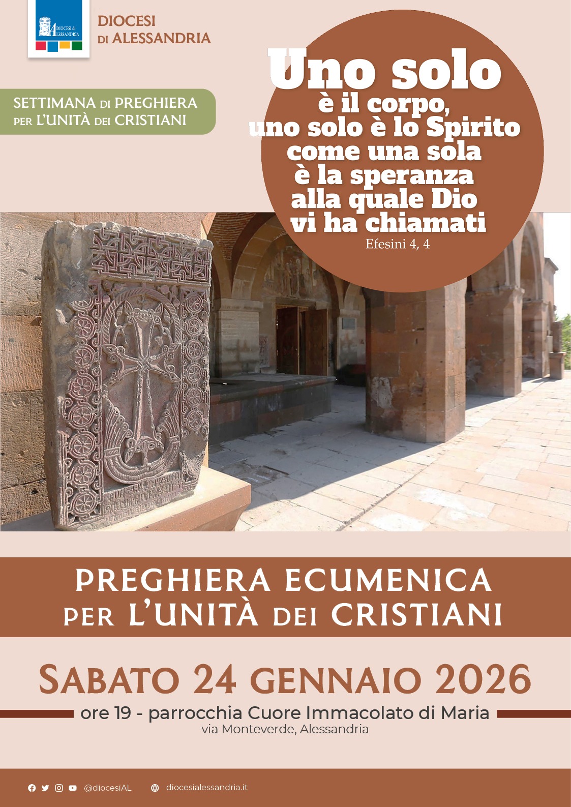 La nostra Diocesi propone una preghiera ecumenica che si terrà sabato 24 gennaio 2026, alle ore 19, presso la parrocchia Cuore Immacolato di Maria, in via Monteverde, ad Alessandria.