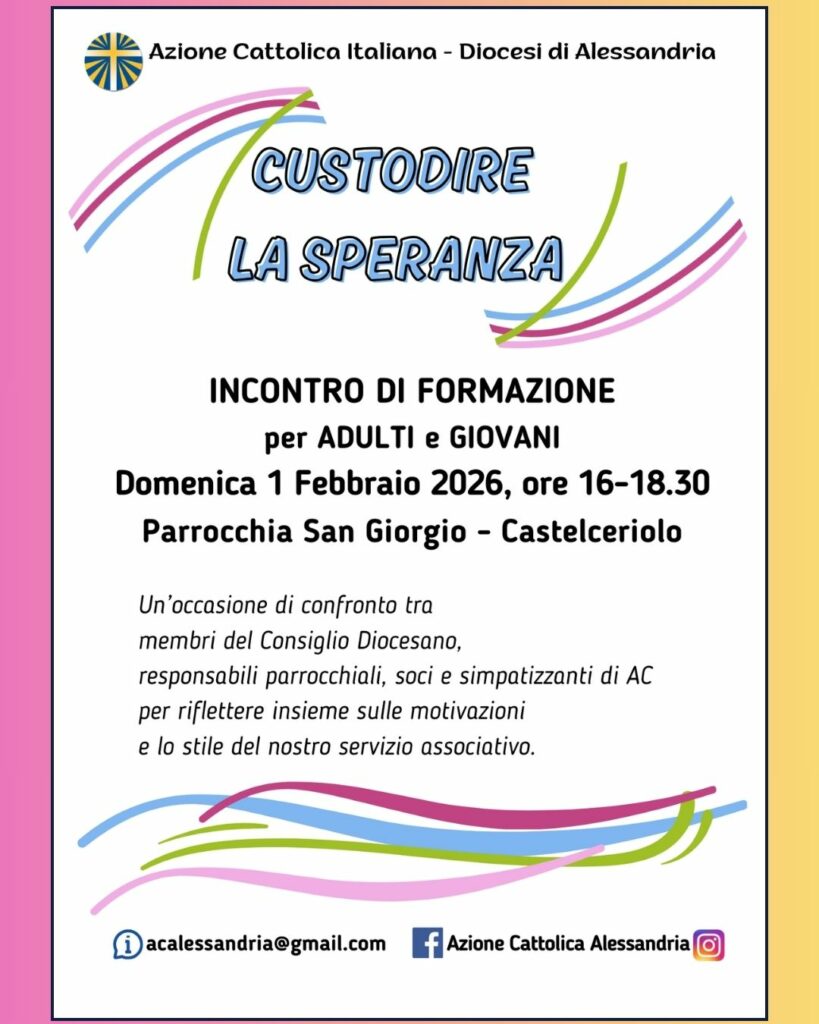 Domenica 1 febbraio 2026 l’Azione Cattolica Italiana della Diocesi di Alessandria promuove un incontro di formazione dal titolo “Custodire la speranza”, rivolto ad adulti e giovani. L’appuntamento è in programma dalle ore 16 alle 18.30 presso la parrocchia San Giorgio di Castelceriolo.