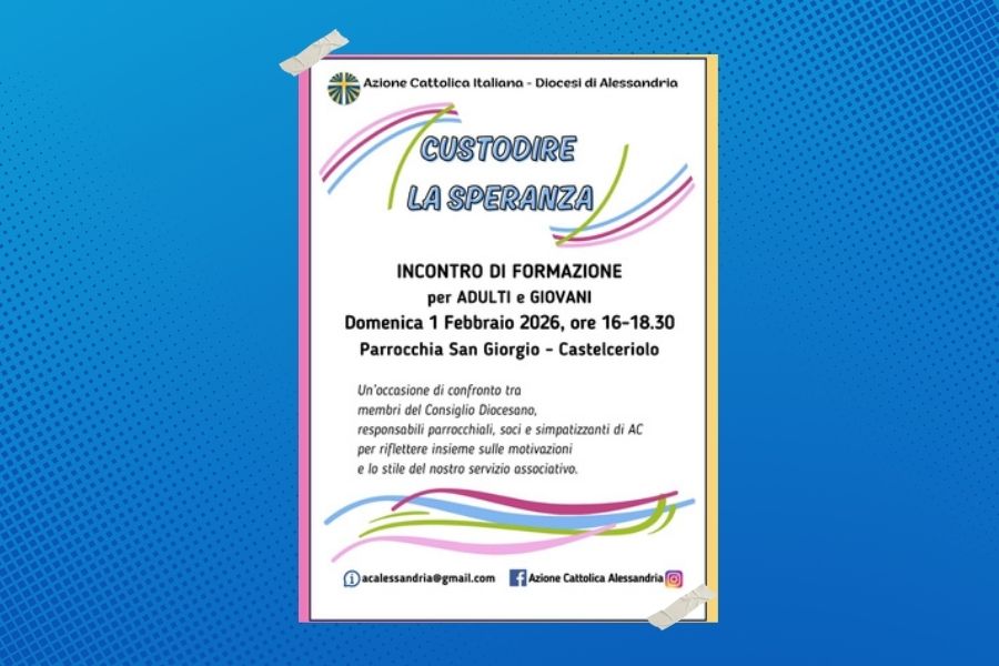 Domenica 1 febbraio 2026 l’Azione Cattolica Italiana della Diocesi di Alessandria promuove un incontro di formazione dal titolo “Custodire la speranza”, rivolto ad adulti e giovani. L’appuntamento è in programma dalle ore 16 alle 18.30 presso la parrocchia San Giorgio di Castelceriolo.