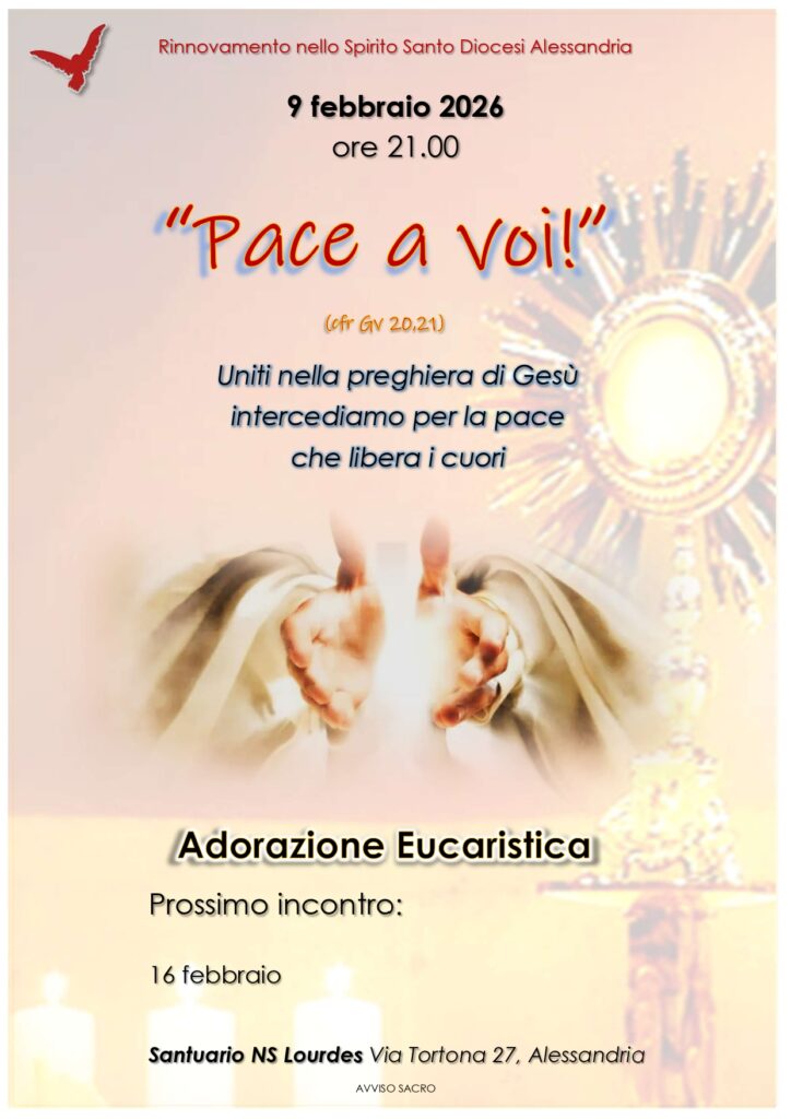 I gruppi del Rinnovamento nello Spirito Santo della Diocesi di Alessandria uniti nella preghiera intercedono per la pace e presentano al Signore il nostro vescovo Guido e la nostra diocesi: tutta la comunità è invitata a partecipare.