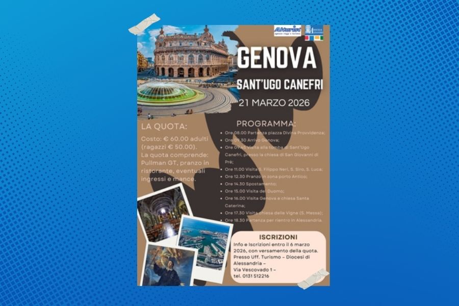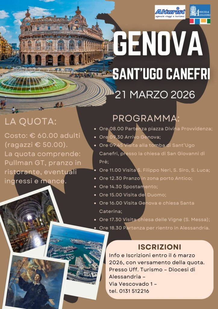 La Diocesi di Alessandria propone per sabato 21 marzo 2026 una giornata a Genova, dedicata in particolare alla figura di Sant’Ugo Canefri, con un itinerario tra fede, arte e scoperta della città.