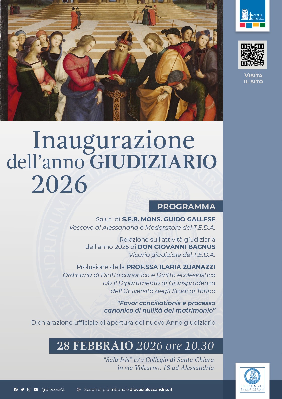 Sarà inaugurato sabato 28 febbraio 2026 alle ore 10.30 il nuovo Anno giudiziario del Tribunale Ecclesiastico Diocesano di Alessandria. L’appuntamento si terrà nella “Sala Iris” del Collegio di Santa Chiara, in via Volturno 18 ad Alessandria.