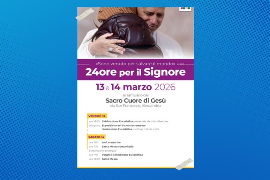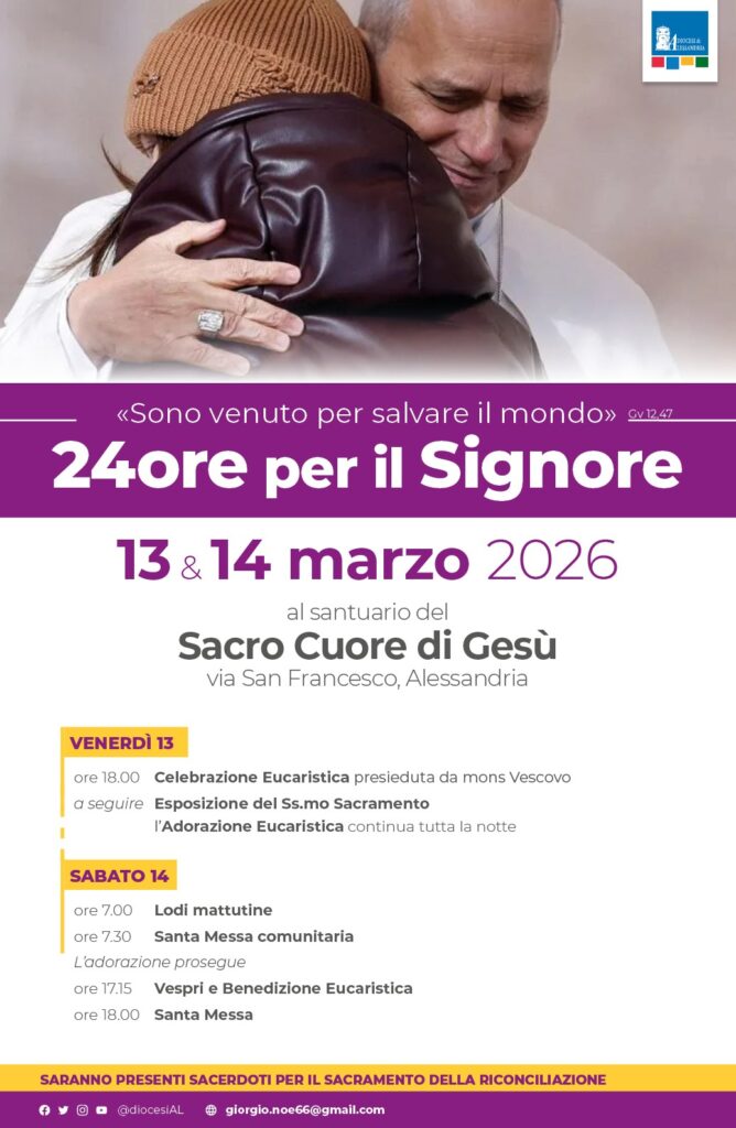 La Diocesi di Alessandria invita tutta la comunità a partecipare all’iniziativa diocesana “24ore per il Signore”, un tempo speciale di preghiera, adorazione e rinnovamento spirituale. L’appuntamento è per il 13 e 14 marzo 2026 presso il santuario del Sacro Cuore di Gesù, in via San Francesco ad Alessandria.