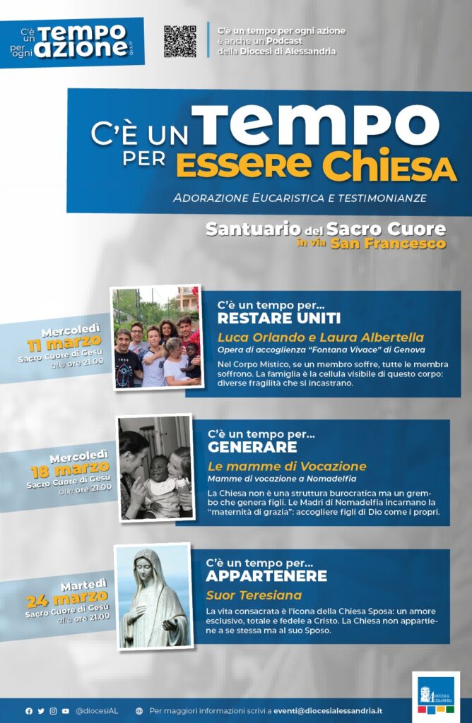 La Diocesi di Alessandria vi invita a “C’è un tempo per essere chiesa”, un ciclo di tre incontri speciali presso il Santuario del Sacro Cuore, dove l’Adorazione Eucaristica si intreccerà a testimonianze di vita straordinaria. Tutti gli appuntamenti inizieranno alle ore 21.