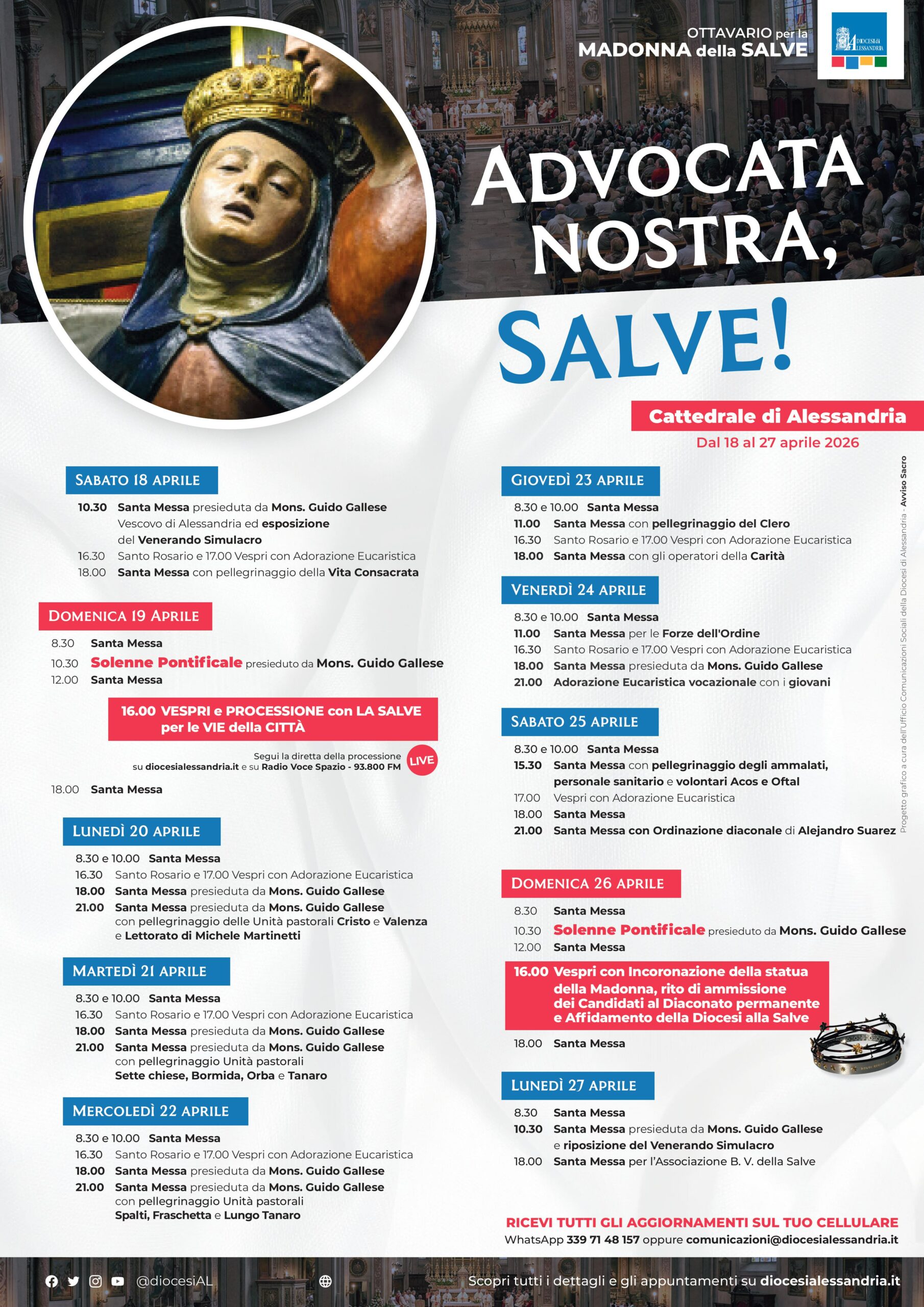 Dal 18 al 27 aprile 2026, la Cattedrale di Alessandria ospiterà celebrazioni, pellegrinaggi e momenti di adorazione eucaristca con il tema “Advocata nostra, Salve!”.